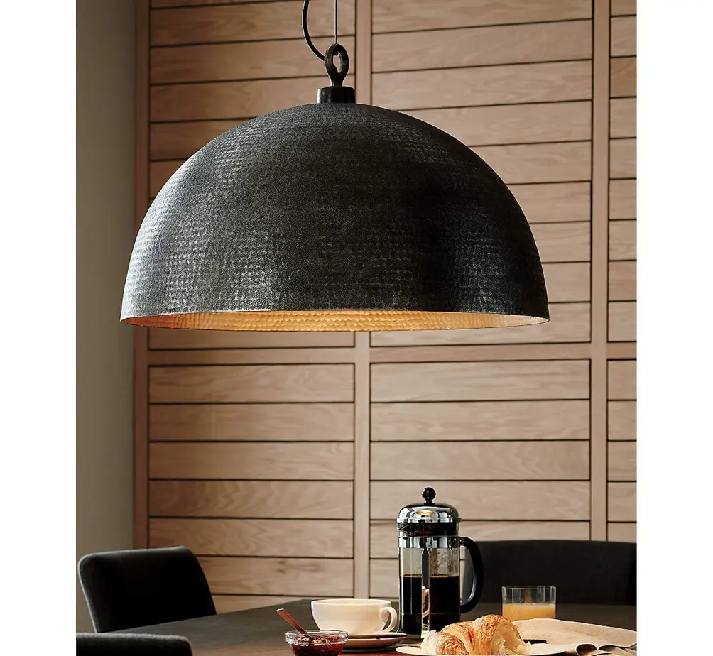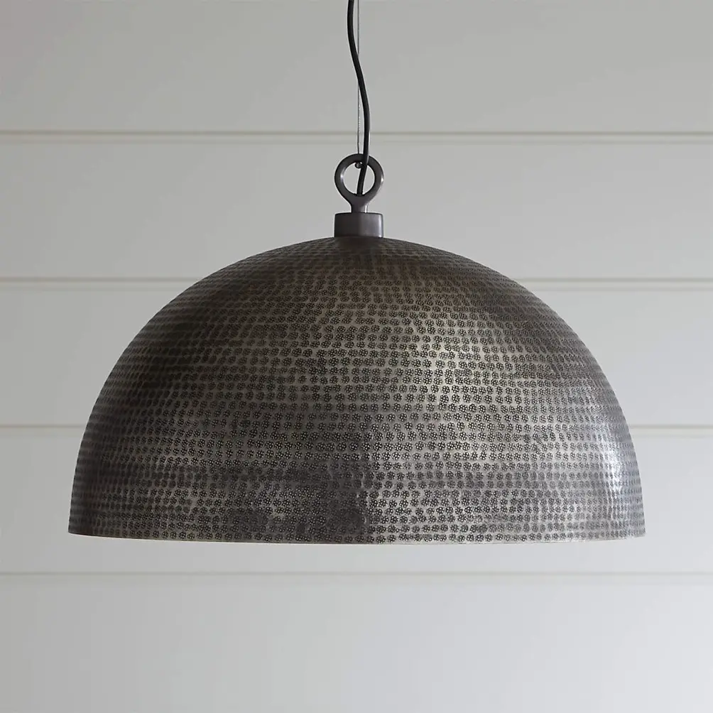 A hammered brass dome pendant adds clean geometry and warm beauty to any space, its brass interior reflecting light with a cozy glow. Hang one above a brass bar cart, two in the bedroom over the bedside tables or three above a kitchen island. Gorgeously textured with timeless, worldly appeal, the softly rounded pendant hangs from an iron ceiling plate finished in brass to match the aluminum dome. A petite loop accents our exclusive brass dome hammered metal pendant light.