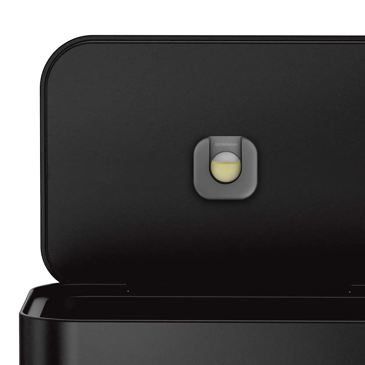 simplehuman’s breakthrough step can features an innovative, integrated drip guard that eliminates the need for an inner bucket and an interior pocket that stores and dispenses liners one at a time, speeding up change time and increasing trash capacity by 25%. Inside, a stainless steel rim grips the liner to keep unsightly edges concealed. The durable, extra-wide steel step pedal is engineered to last 150,000 steps (that’s more than 20 steps a day for 20 years). Patented lid technology ensures a smooth, silent close every time, while an internal hinge prevents the lid from bumping the wall. Liner refill packs slip easily into the back of the built-in liner pocket.